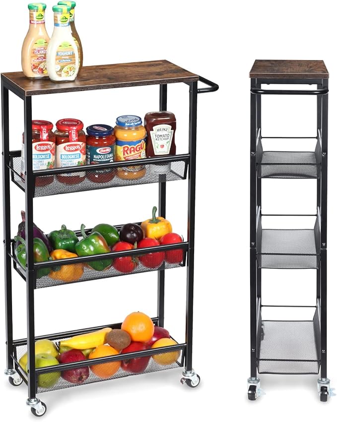 Carrito de Cocina con Ruedas, Carrito Estrecho,Carrito de Servicio de 4 Niveles, Carro con cestas metálicas con Tapa de Madera, Carro de Ahorro de Espacio para la Cocina, Baño, Restaurante