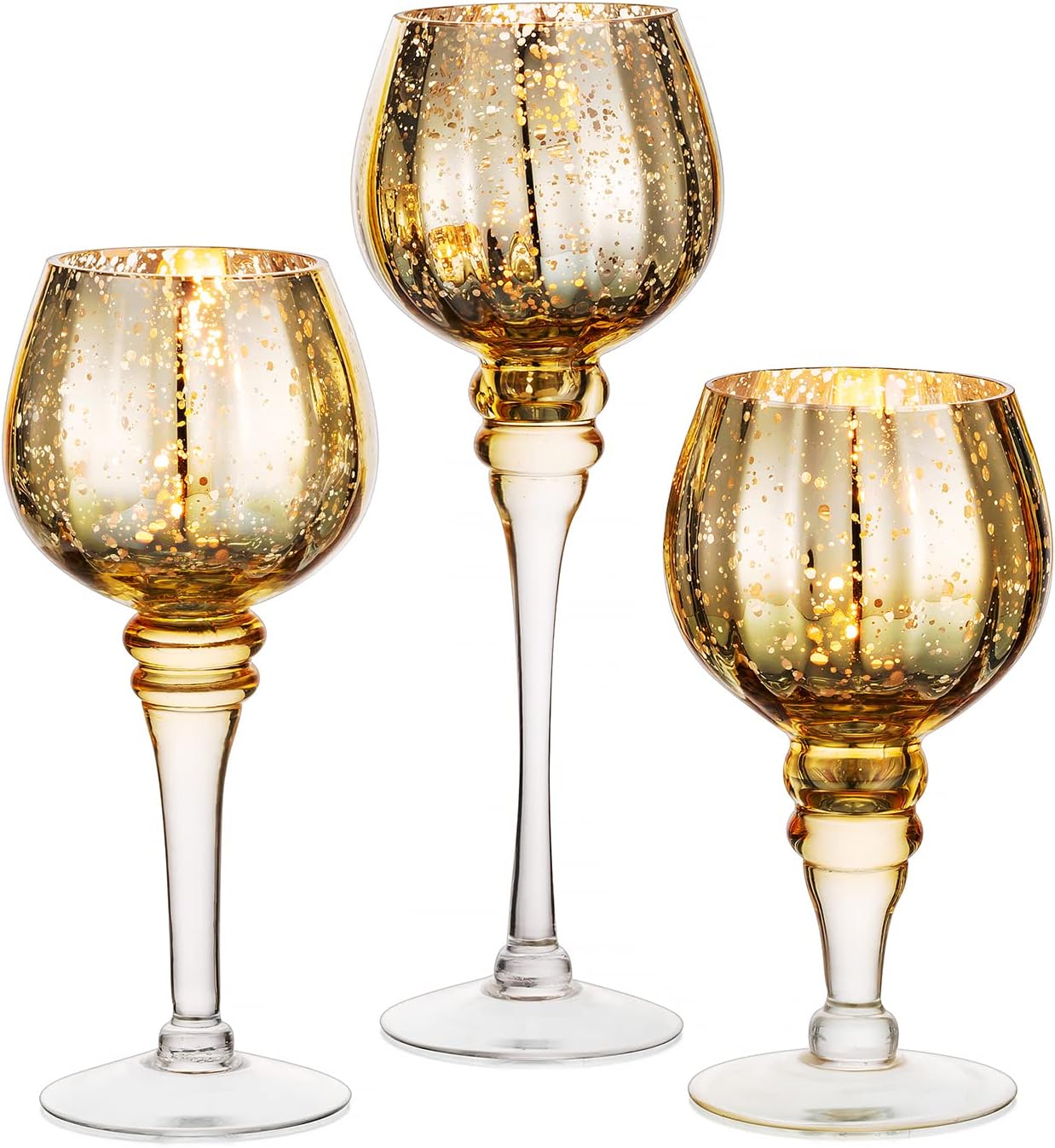 Nuptio Portavelas de Vidrio Altos 3 Piezas Portavelas Grandes Luces de Té Doradas Juego de Portavelas de Mesa para Velas Flotantes y de Pilar, Portavelas de Mercurio para Boda Fiesta Navidad