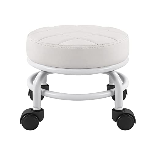 FURWOO Taburete con Ruedas de Cuero de PU, Taburete con Ruedas Redondo y Bajo, Taburete de Piso con Ruedas universales para el hogar, Fitness, Deportes, pedicura, Alto: 25,5 cm (Blanco)