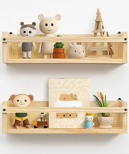 Juego de 2 estantes de pared de Petrala fabricados en 100% madera de pino y ratán. Cada estante mide 13.2 pulgadas y soporta hasta 22 libras. Ideal para habitaciones de niños, dormitorios y salas de e