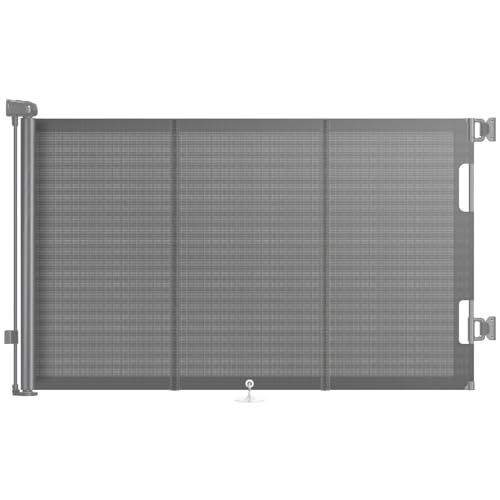 Barrera de seguridad enrollable, ajustable de 0 a 150 cm, adecuada para uso con niños y mascotas. Fabricación resistente y fácil instalación. Ideal para hogares con niños pequeños y perros de diferentes tamaños.