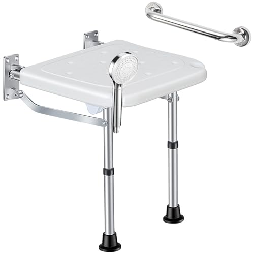 Silla de ducha plegable montada en la pared, con capacidad de carga de 180 kg. Se ajusta entre 16.5' y 20.9'. Fabricada en aleación de aluminio engrosado, resistente al desgaste y al envejecimiento. Diseño de estabilidad triangular, almohadillas antideslizantes y pasamanos de acero inoxidable. Se pliega 90° para ahorrar espacio. Fácil instalación con pernos incluidos.