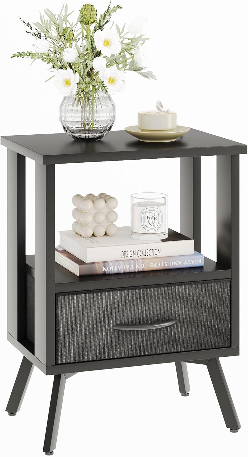 Mesa auxiliar negra CAIYUN con un cajón de tela y estante abierto, mesita de noche con patas metálicas resistentes, diseño moderno para espacios pequeños, mesita de noche de madera.