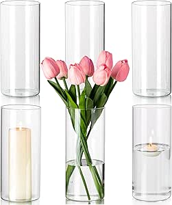 Juego de jarrones cilíndricos de vidrio Hewory: jarrones de vidrio de 19 cm de alto, juego de 6 jarrones de vidrio para decoración de mesas de boda: candelabros, portavelas, juego de jarrones cilíndricos de vidrio, cilindros de vidrio para velas, decoraciones de boda, fiestas, hogar, boda