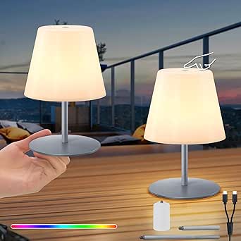 RWWR - Pack de 2 minilámparas de mesa inalámbricas, regulables en blanco cálido y 7 colores, con batería recargable tipo C, para exteriores, dormitorio, balcón, patio y terraza (plateadas, interruptor táctil)
