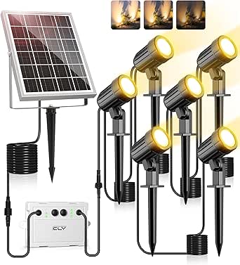 Luces solares para jardín CLY, paquete de 6, blanco cálido de 2700 K, 2 modos dinámicos, 3 niveles de brillo, iluminación solar con estaca, 6000 mAh, resistencia al agua IP66, focos solares para jardín, césped y patio.