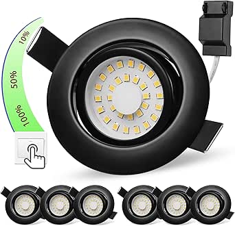Focos LED empotrables, negros, 230 V, regulables, 5 W, atenuación de 3 etapas, focos de techo IP44, 68 mm, blanco neutro 4000 K, giratorios 45°, focos de techo planos para dormitorios, juego de 6