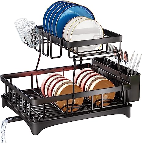 Escurreplatos, SAYZH Escurridor De Platos Desmontable De 2 Niveles, Organizador De Escurridor De platos De Gran Capacidad Con Soporte Para Utensilios, Estante Para Tazas Para Mostrador De Cocina,Negro